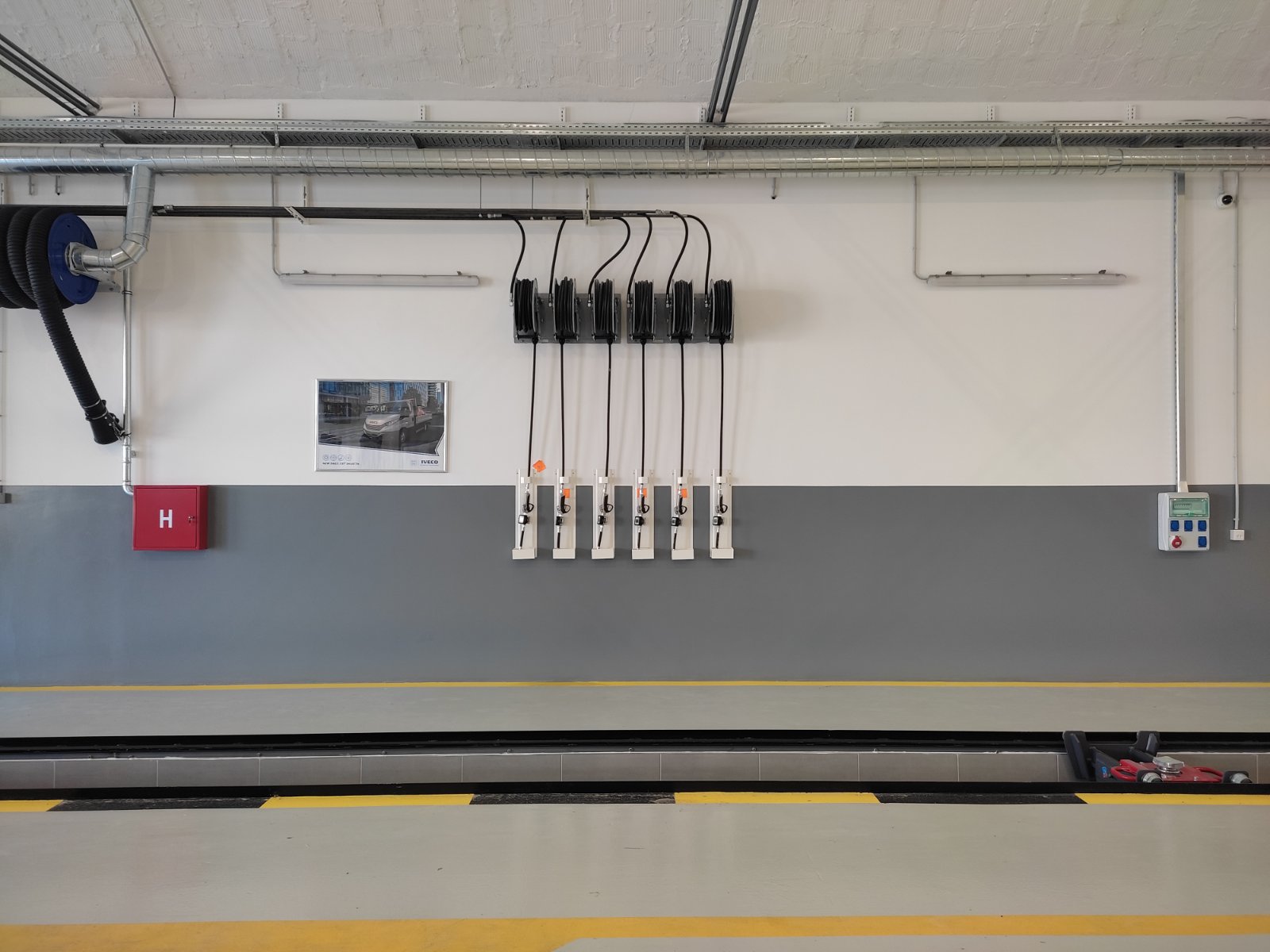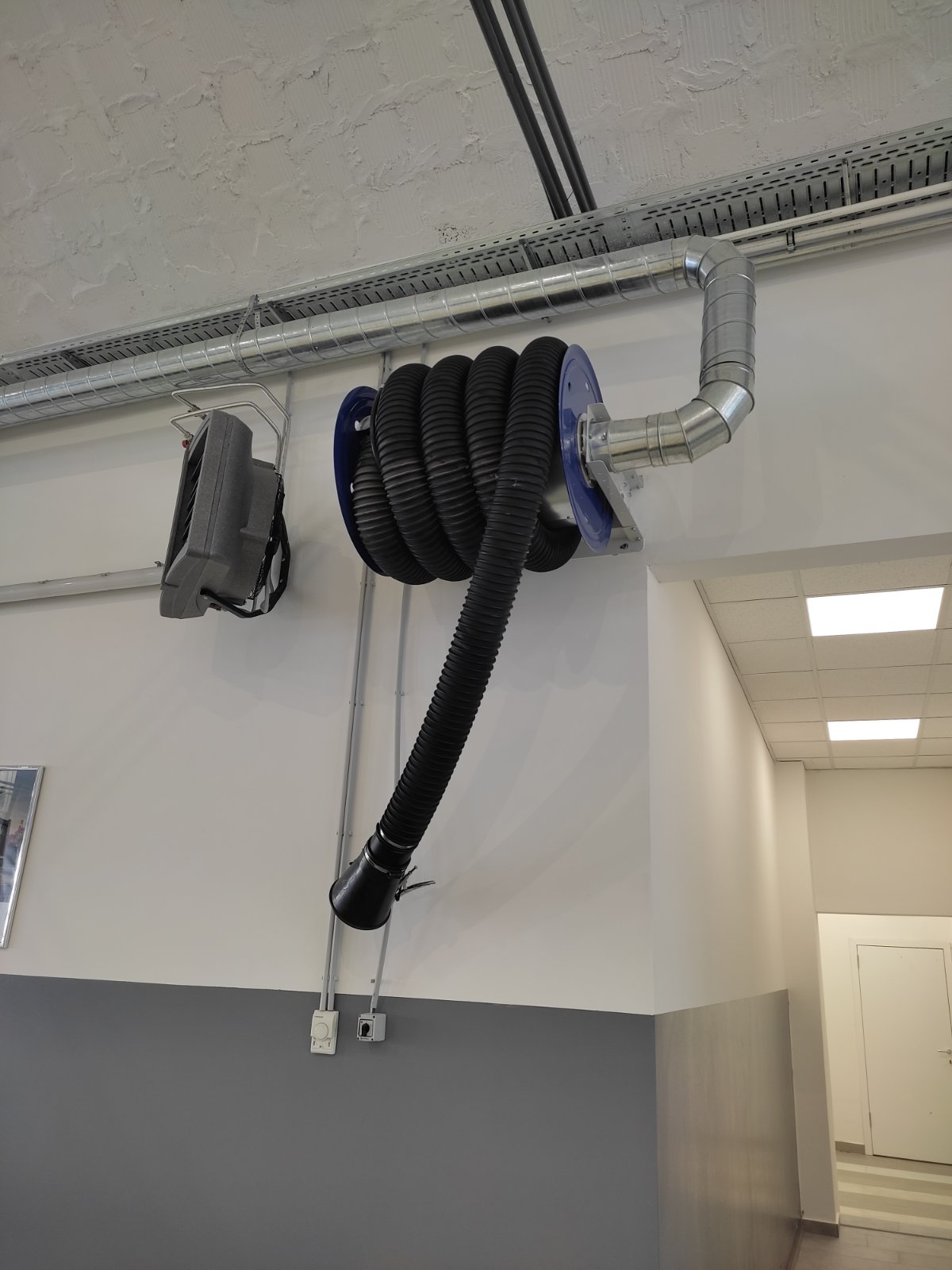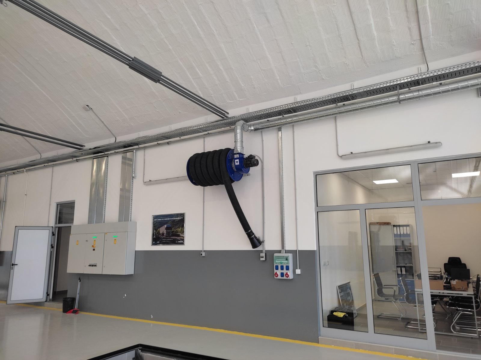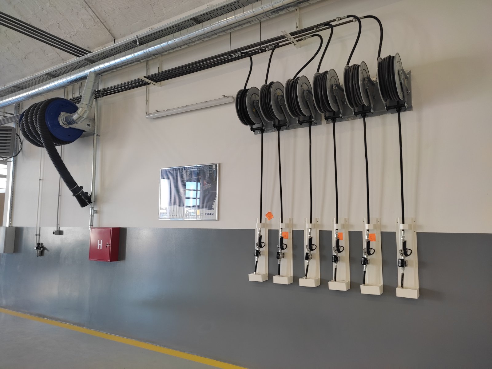 -Isporuka i montaža sistema za odsisavanje i ekstrakciju gasova Italijanskog proizvođača FILCAR, isporučen je sistem za odsisavanje izduvnih gasova sa automatskim upravljanjem fleksibilnog creva prečnika 125 mm dužine 13 m za teretni program DRWA-125/13-SB FILCAR,Sistem za odsisavanje izduvnih gasova sa automatskim upravljanjem creva Fi 125 mm dužine 10 m bez ventilatora DRW-125/10-SB FILCAR,Centrifugalni ventilator sa flanšama snage 1,5 kW / 2,0 hp 230/400 V 50 Hz AL-200/D FILCAR.