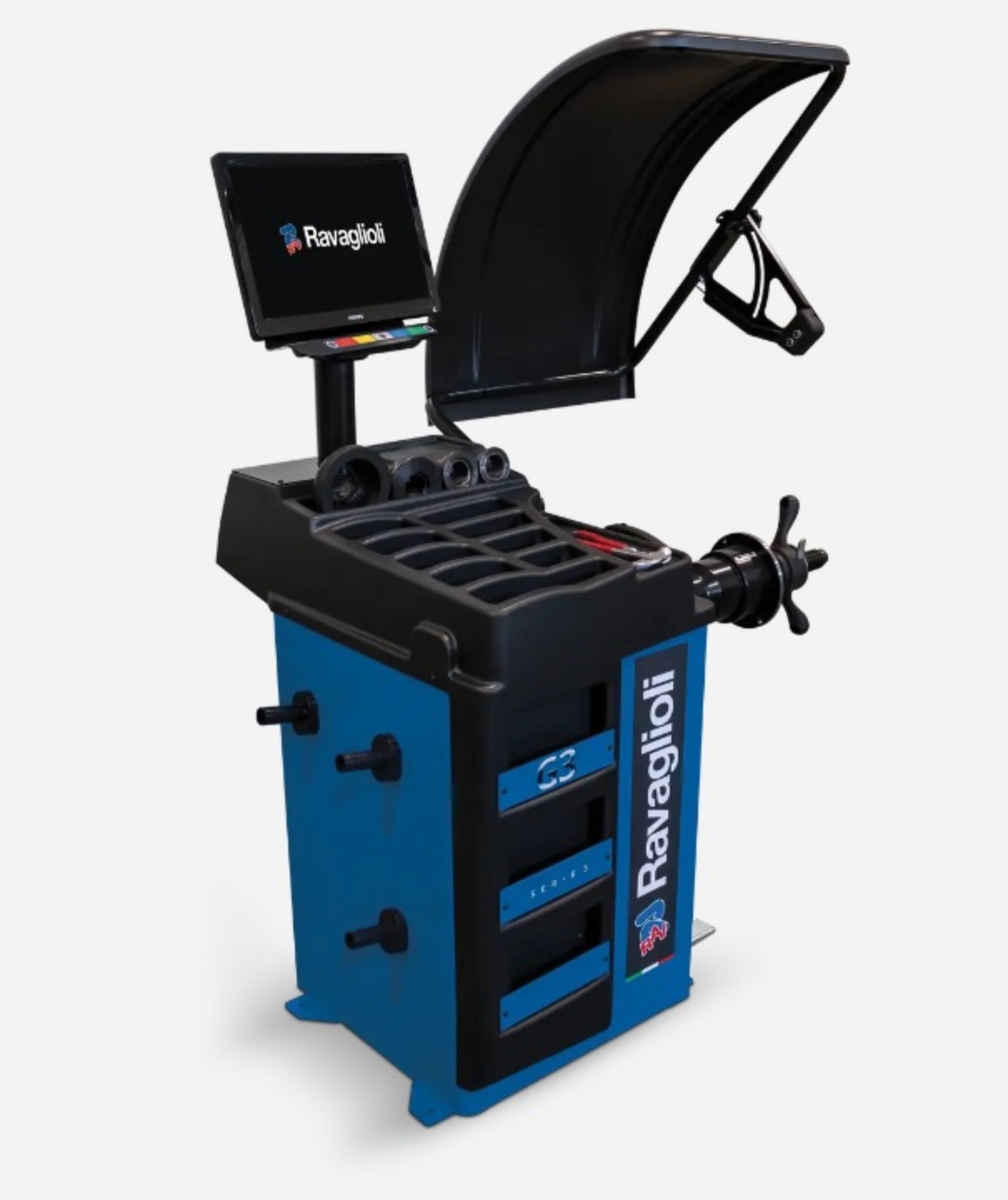 RAVAGLIOLI mašina za balansiranje je opremljena sa zaštitnim poklopcem, što doprinosi bezbednosti prilikom rada. Automatsko učitavanje udaljenosti, prečnika naplatka i pozicija za postavljanje tegova čini proces balansiranja bržim i preciznijim, takođe, poseduje laserski pokazivač i duplo LED osvetljenje koje pomaže vulkanizerima u preciznom postavljanju tegova.
